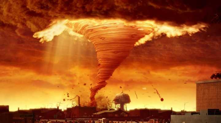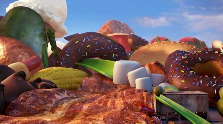 Главный герой мультфильма - странный ученый Флинт Локвуд, который всегда хотел изобрести что-то такое, что сделает его родной городок счастливым. И вот, у него получилось! Еды теперь хватает всем, и она просто падает с неба, создавая новые пейзажи вокруг: можно любоваться закатом с живописных холмов из фруктового желе. Но иногда вкусные осадки в виде фрикаделек могут превратиться в настоящий торнадо из аппетитных, но уже опасных спагетти! Гениальному ученому и его друзьям предстоит исправить положение дел в сытом городке.