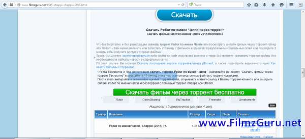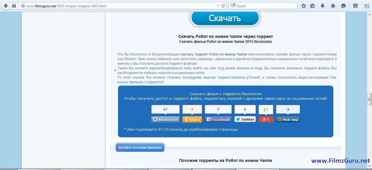 Скачать фильмы бесплатно с торрента или смотреть онлайн2. Лайкнуть или зарепостить статью с фильмом в одной из предложенных социальных сетей или подождите две минуты и торрент-модуль разблокируется автоматически: