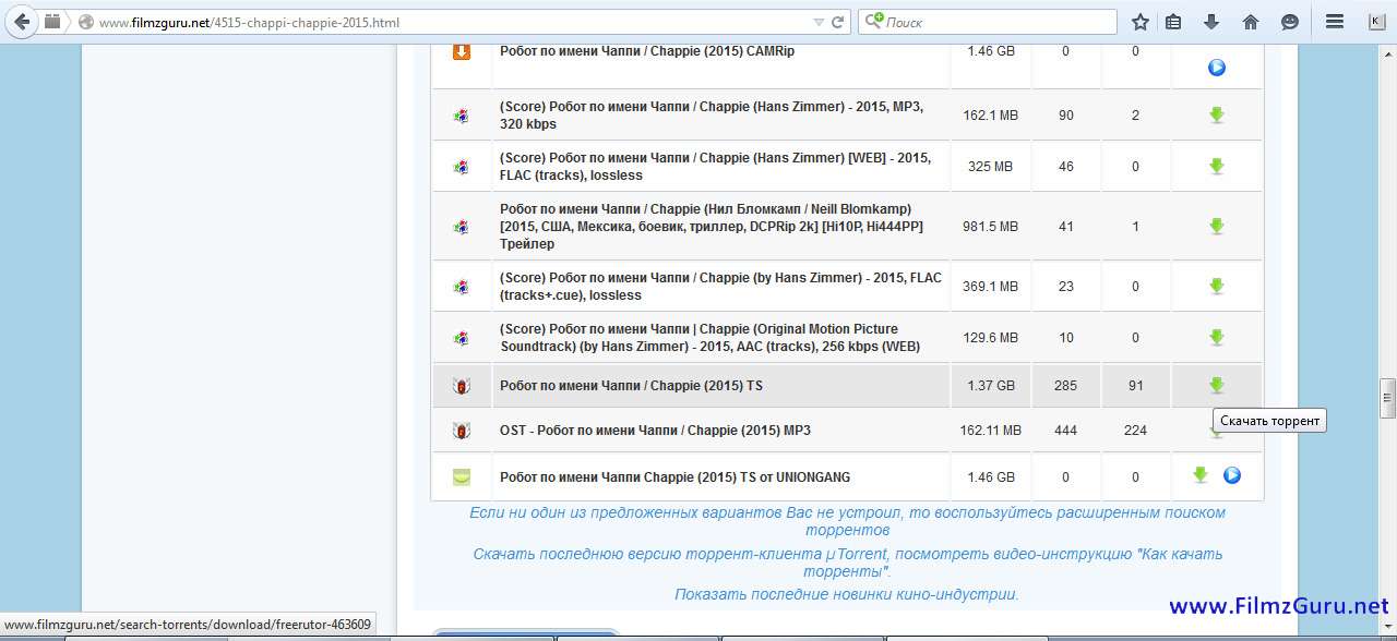 4. Выбирайте нужный торрент-файл по названию, качеству, размеру, количеству сидов / пиров и нажимайте кнопочку "Скачать торрент":